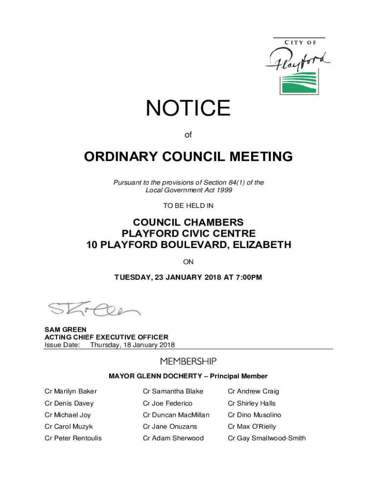 This document serves as a notice for the Ordinary Council Meeting scheduled for 23 January 2018, detailing the agenda, including strategic plans and specific reports related to community services, urban development, and local governance matters within the City of Playford.