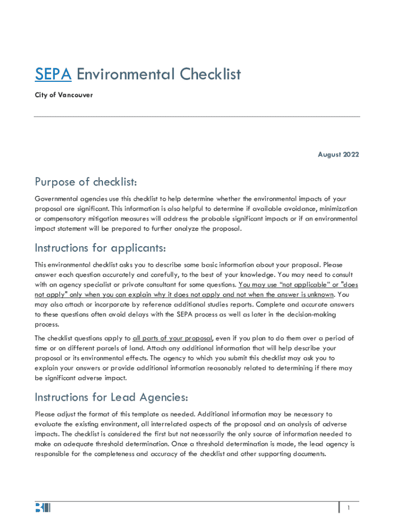 SEPA Environmental Checklist City of VancouverAugust 2022Purpose of checklist: Governmental agencies use this checklist to help determine whether the environmental impacts of your proposal are significant.