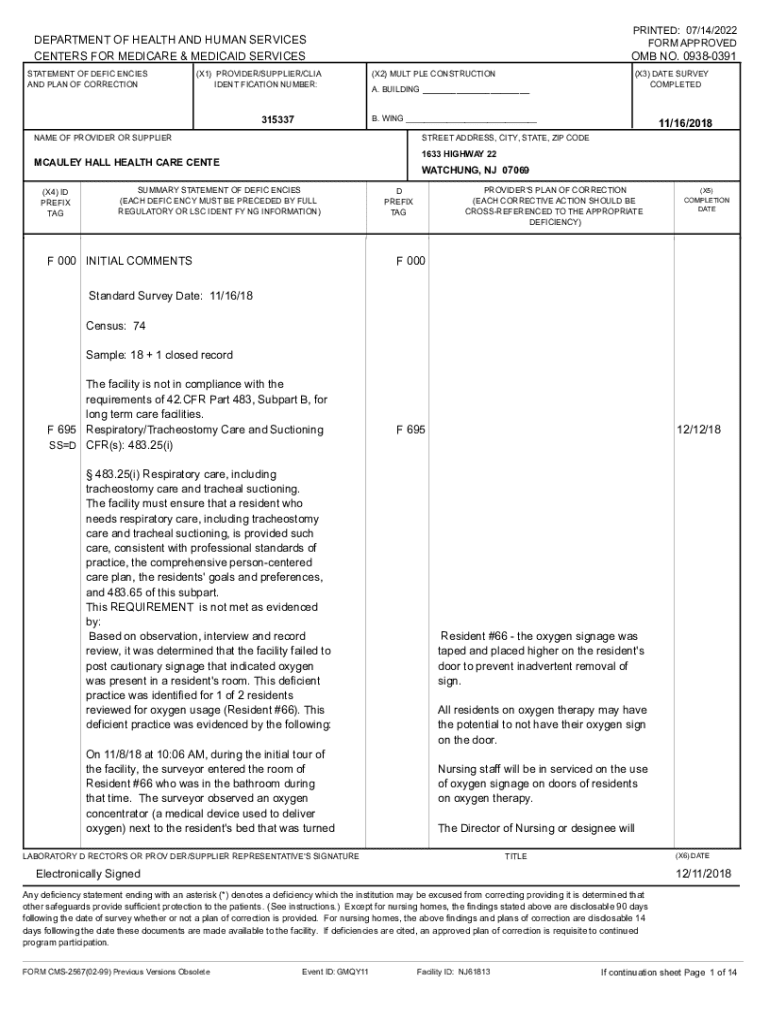 PRINTED: 07/14/2022 FORM APPROVEDDEPARTMENT OF HEALTH AND HUMAN SERVICES CENTERS FOR MEDICARE & MEDICAID SERVICES STATEMENT OF DEFIC ENCIES AND PLAN OF CORRECTION(X1) PROVIDER/SUPPLIER/CLIA IDENT