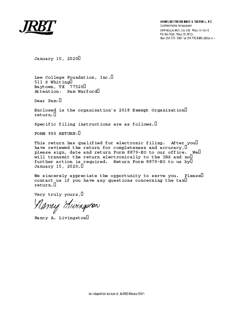 This document is the Form 990 filed by the Lee College Foundation, Inc., detailing its financial activities, governance, and compliance with tax regulations as a nonprofit organization for the tax year ending August 31, 2019. It includes disclosures of revenue, expenses, grants, and other relevant financial information.