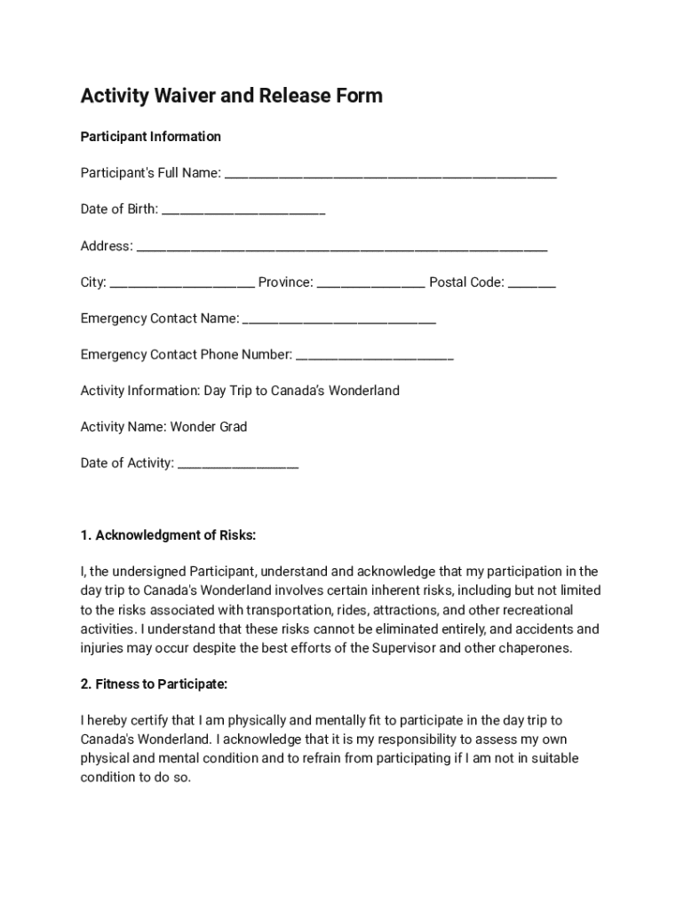 This form serves as a waiver and release of liability for participants in a day trip to Canada\'s Wonderland organized by JOURNIES CORP. It includes acknowledgment of risks involved, fitness to participate, consent to medical treatment, and acceptance of the no refund or cancellation policy, among other terms.
