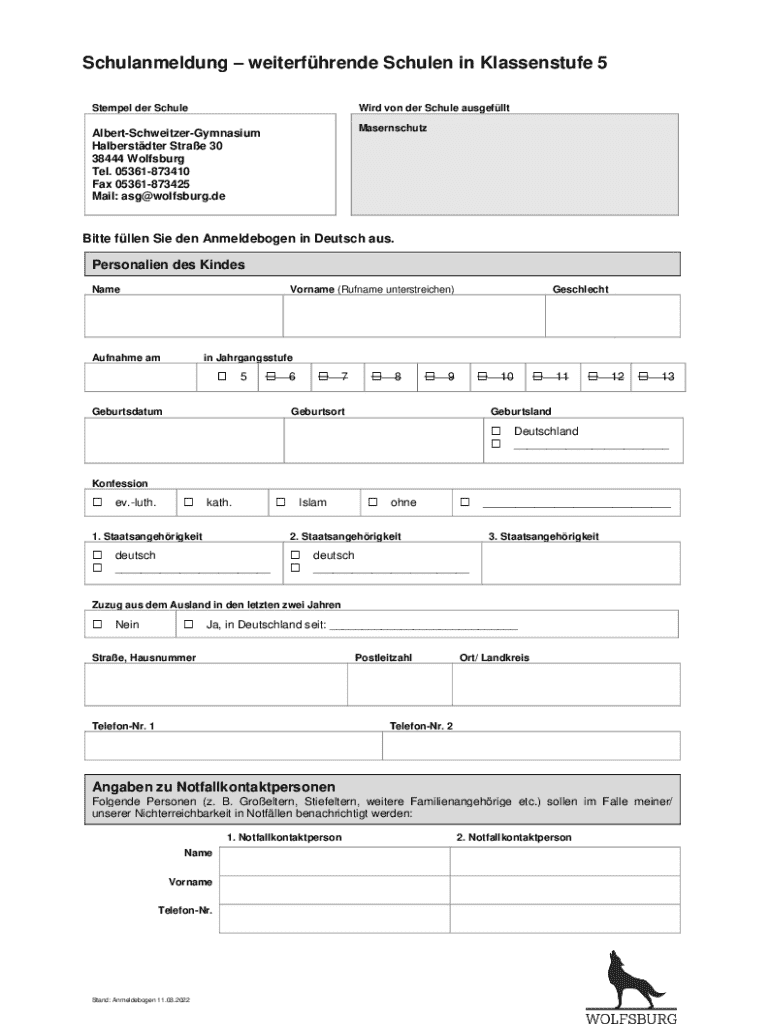Schulanmeldung weiterfhrende Schulen in Klassenstufe 5 Stempel der SchuleWird von der Schule ausgefllt MasernschutzAlbertSchweitzerGymnasium Halberstdter Strae 30 38444 Wolfsburg Tel. 05361873410