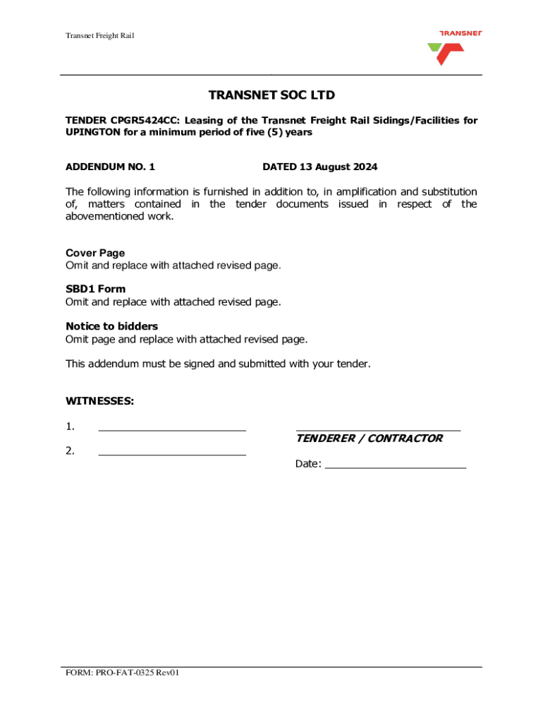 This document is an addendum to the request for proposals for leasing Transnet Freight Rail Sidings and facilities at Upington for a minimum period of five years. It includes important updates to the tender documents, deadlines for submission, and instructions for bidders.
