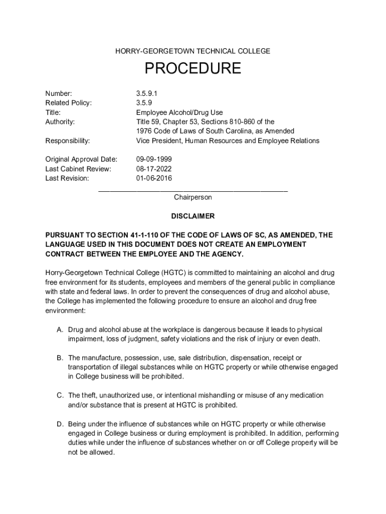 HORRYGEORGETOWN TECHNICAL COLLEGEPROCEDURE Number: Related Policy: Title: Authority: Responsibility:3.5.9.1 3.5.9 Employee Alcohol/Drug Use Title 59, Chapter 53, Sections 810860 of the 1976 Code of