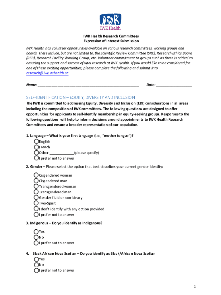 This document outlines the process for volunteering on various research committees at IWK Health, emphasizing commitment to equity, diversity, and inclusion in representation.