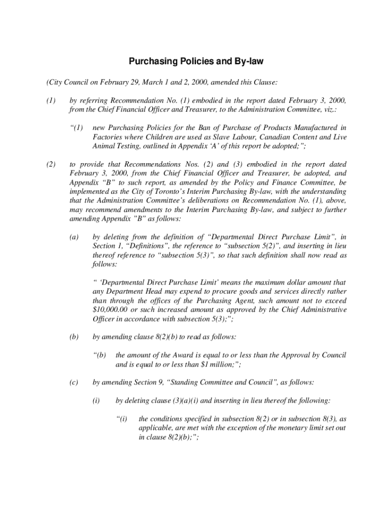 Purchasing policies and by-laws are formal documents that outline the regulations, procedures, and guidelines that govern the procurement processes within an organization or jurisdiction. They are designed to ensure transparency, fairness, and compliance in purchasing activities.