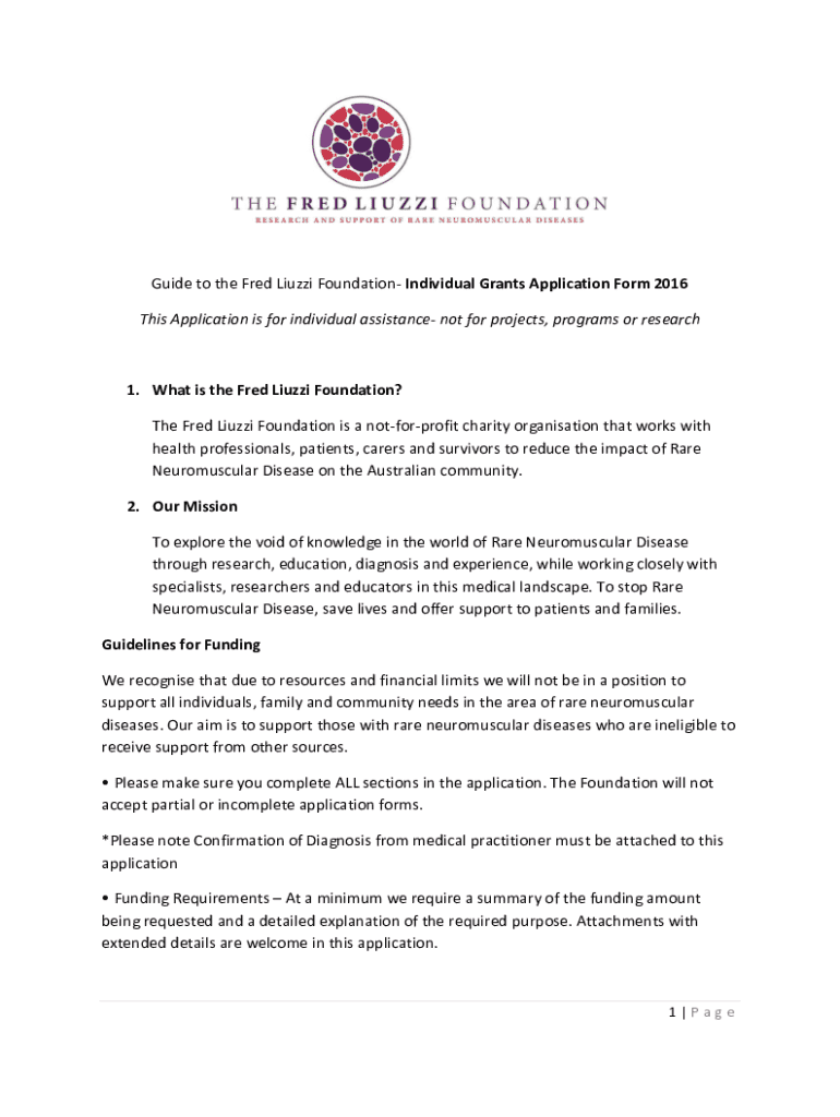 Guide to the Fred Liuzzi Foundation Individual Grants Application Form 2016 This Application is for individual assistance not for projects, programs or research1. What is the Fred Liuzzi Foundation?