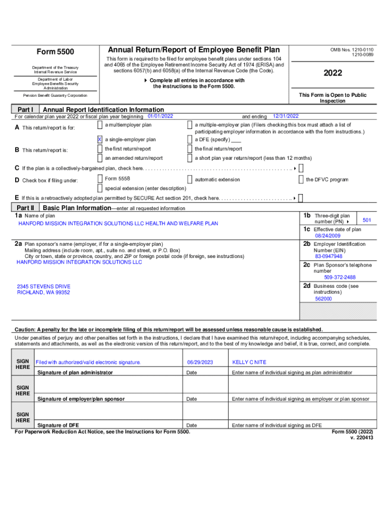 This form is required to be filed for employee benefit plans under ERISA and the Internal Revenue Code. It includes detailed financial information, participant statistics, and insurance coverage related to the employee welfare plan for Hanford Mission Integration Solutions LLC.