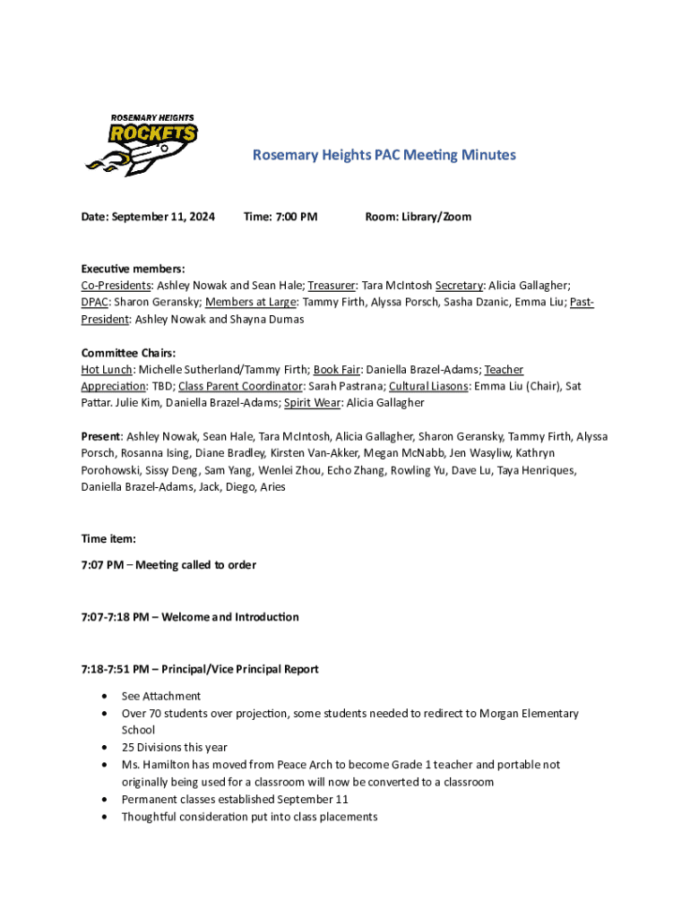 Minutes from the Rosemary Heights Parent Advisory Council meeting held on September 11, 2024, covering various topics including school enrollment, reports from the principal and treasurer, upcoming events, and community involvement.