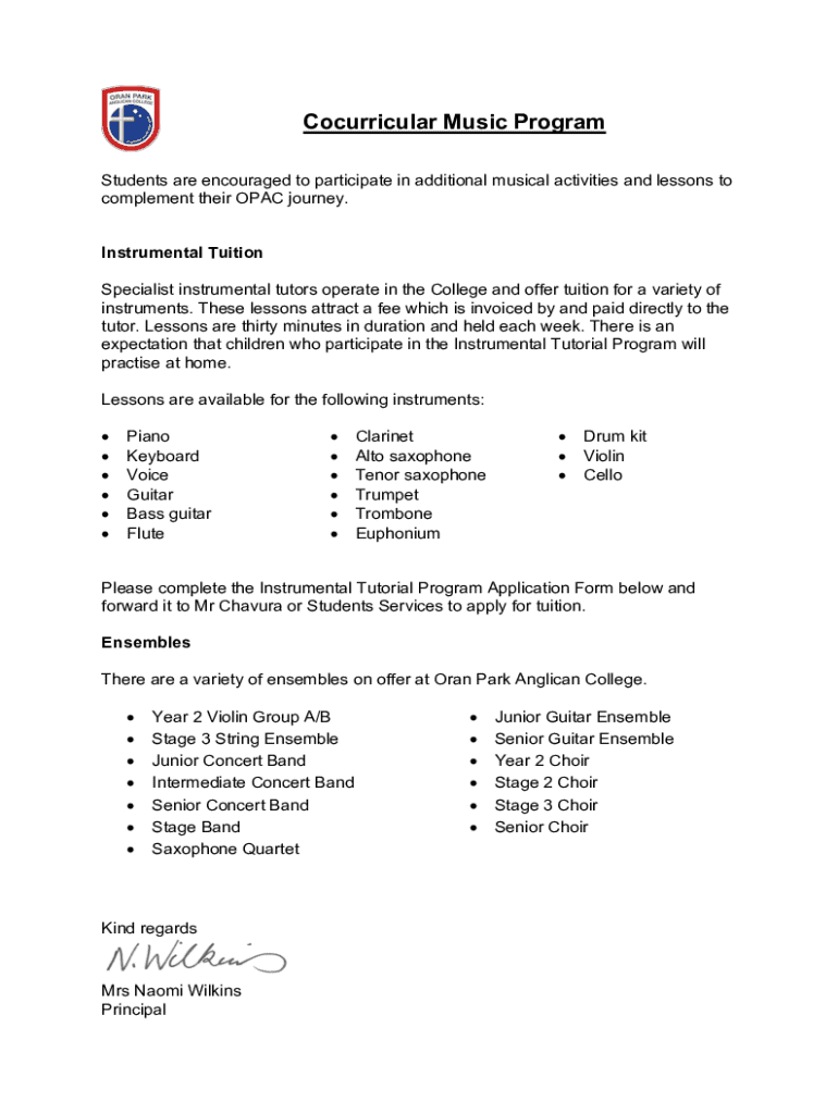 Cocurricular Music Program Students are encouraged to participate in additional musical activities and lessons to complement their OPAC journey. Instrumental Tuition Specialist instrumental tutors