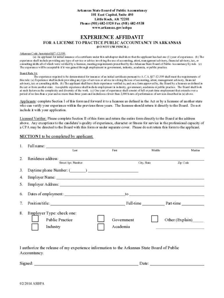 This affidavit is required for applicants seeking initial issuance of a certificate to practice public accountancy in Arkansas. It documents the applicant\'s experience in accounting-related services that must be verified by a licensed verifier.