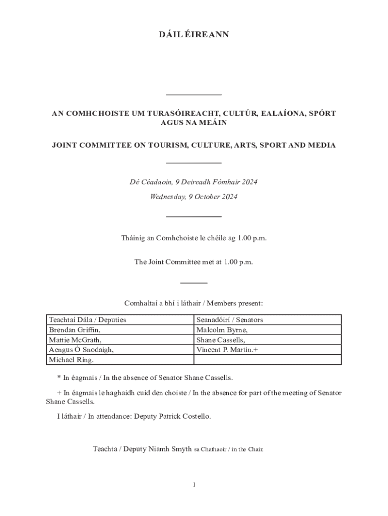 DIL IREANNAN COMHCHOISTE UM TURASIREACHT, CULTR, EALAONA, SPRT AGUS NA MEIN JOINT COMMITTEE ON TOURISM, CULTURE, ARTS, SPORT AND MEDIAD Cadaoin, 9 Deireadh Fmhair 2024 Wednesday, 9 October 2024Thinig
