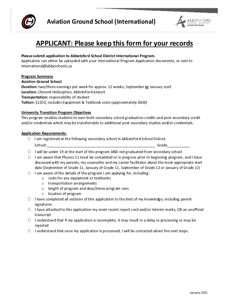 Aviation Ground School (International)APPLICANT: Please keep this form for your records Please submit application to Abbotsford School District International Program. Application can either be uploaded