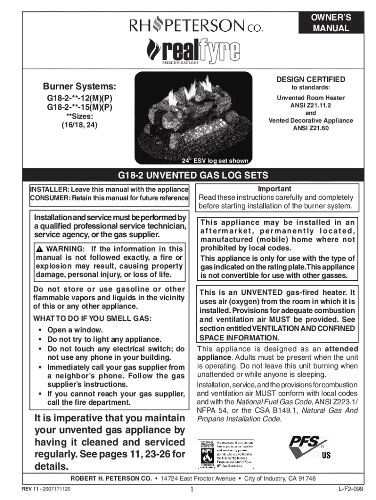 OWNERS MANUALDESIGN CERTIFIEDBurner Systems:to standards:G182**12(M)(P) G182**15(M)(P)Unvented Room Heater ANSI Z21.11.2 and Vented Decorative Appliance ANSI Z21.60**Sizes: (16/18, 24)24\" ESV log