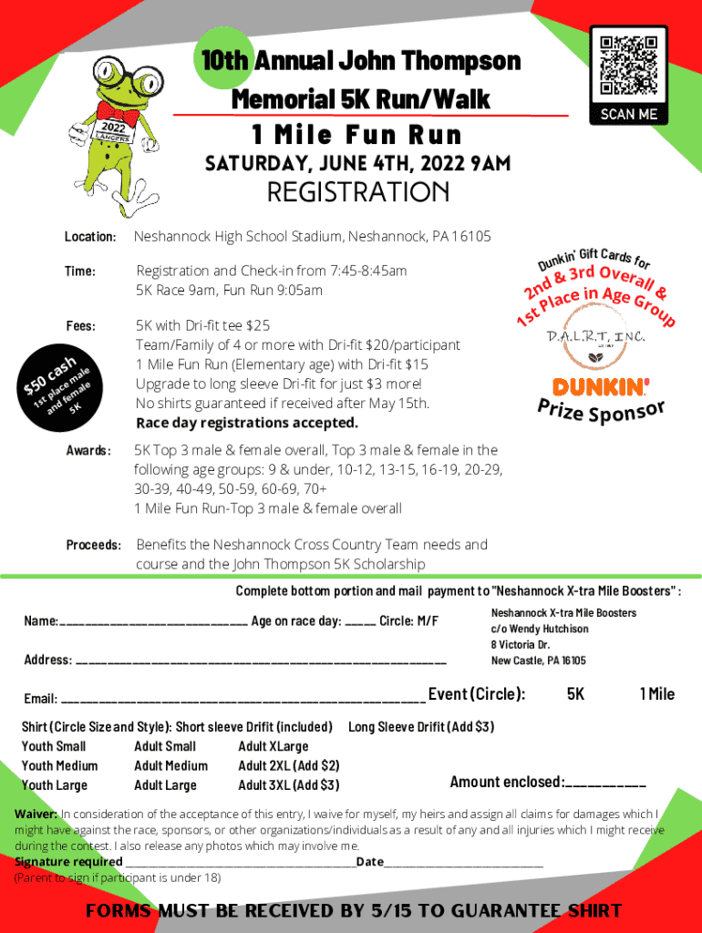 Registration form for the 10th Annual John Thompson Memorial 5K Run/Walk event, featuring a 1 Mile Fun Run and opportunities for various age groups. The event will benefit the Neshannock Cross Country Team needs and the John Thompson 5K Scholarship.
