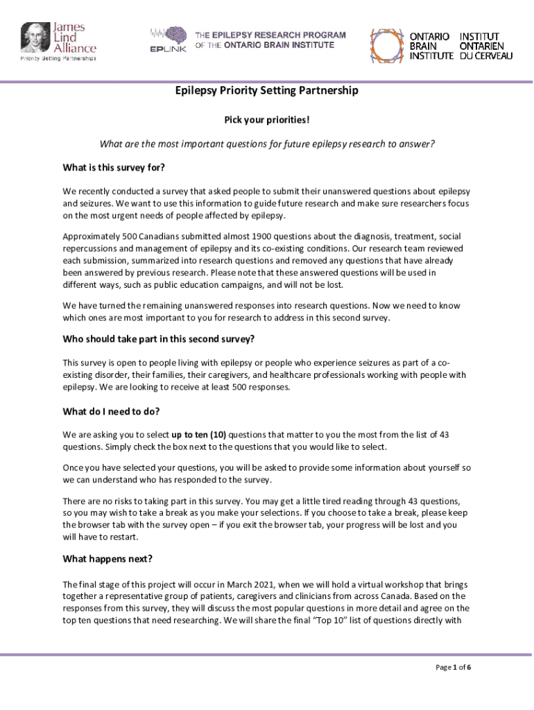 This survey aims to gather insights from individuals living with epilepsy, their families, caregivers, and healthcare professionals about the most pressing questions in epilepsy research. The collected data will guide future research efforts to address key areas of concern identified by the community.