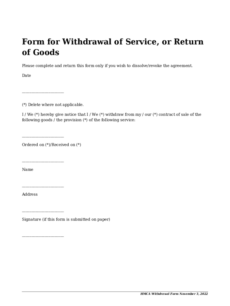 This form is to be completed and returned by individuals wishing to dissolve or revoke an agreement related to a contract of sale for goods or provision of services.