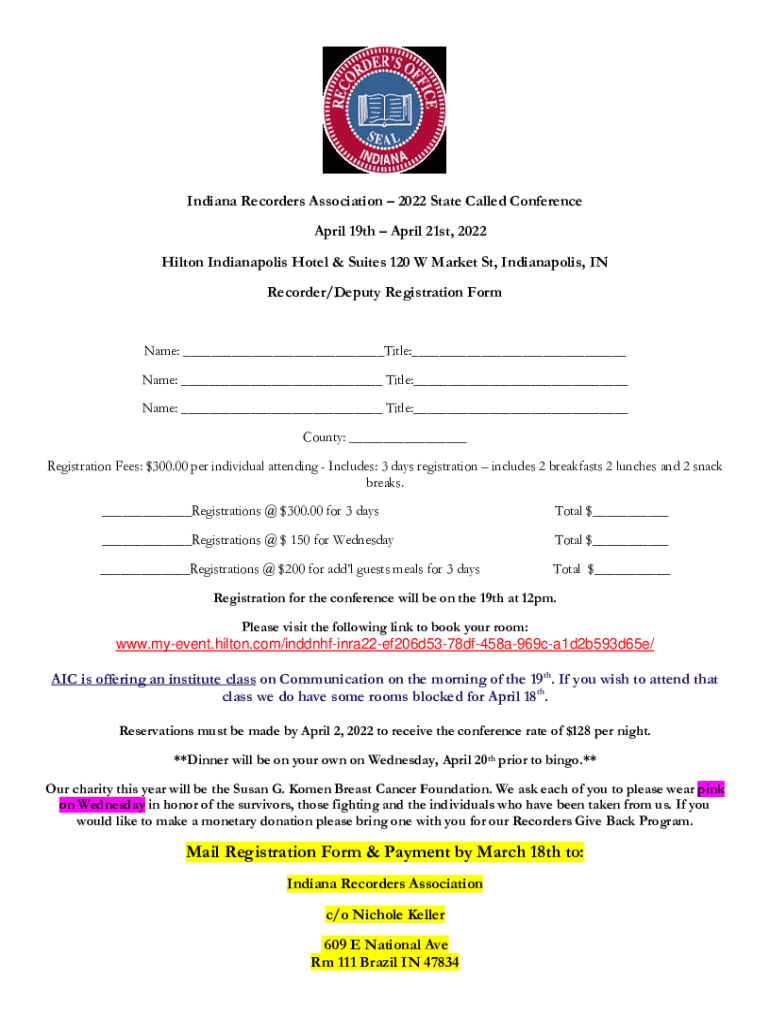 This document serves as a registration form for the Indiana Recorders Association\'s 2022 State Called Conference being held from April 19th to April 21st, 2022, at the Hilton Indianapolis Hotel & Suites. It details registration fees, meal inclusions, and accommodation booking information, along with instructions for mailing the registration form and payment. Additionally, it highlights the charity event for Susan G. Komen Breast Cancer Foundation.