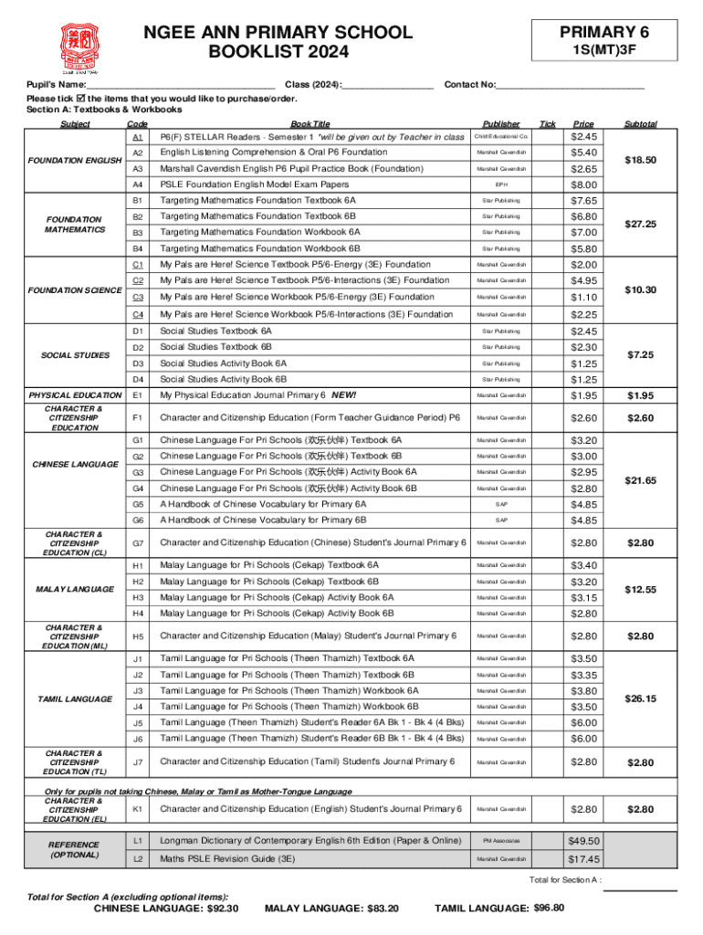 This document is the booklist for Primary 6 students at Ngee Ann Primary School for the year 2024. It includes required textbooks, workbooks, and stationery items, along with options for additional and optional purchases. It provides detailed information on subjects, publishers, and prices.