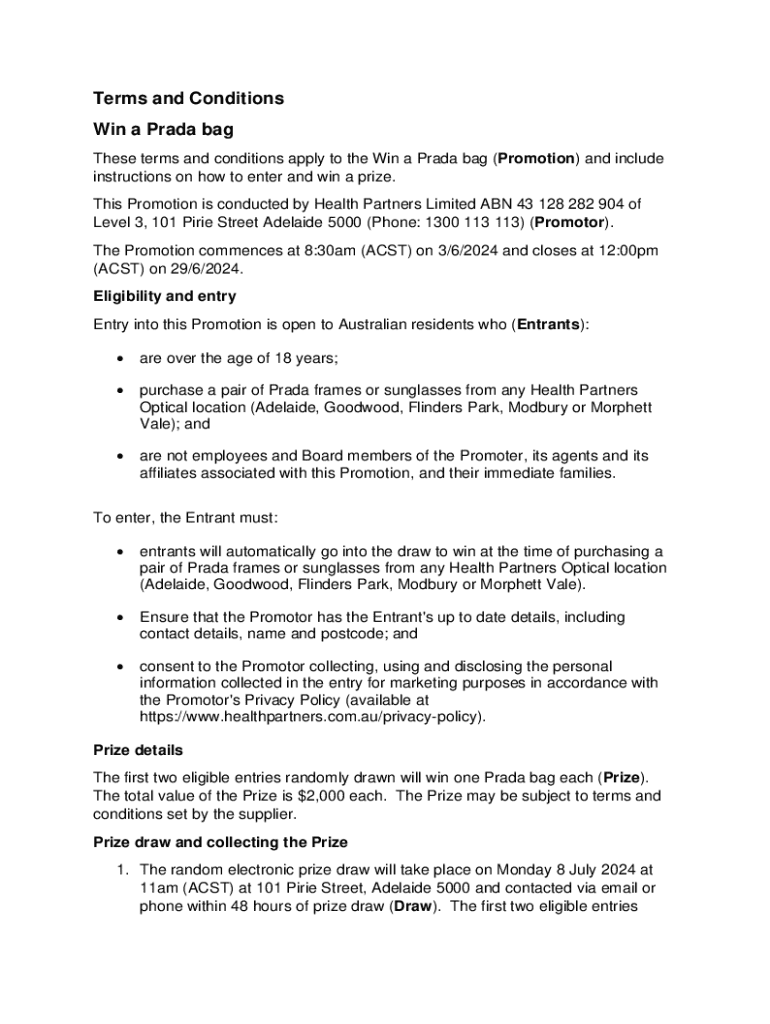 This document outlines the terms and conditions for entering the Win a Prada Bag Promotion conducted by Health Partners Limited. It provides eligibility criteria, entry instructions, prize details, and the process for prize draw and collection. The document emphasizes the importance of personal information handling, rights of the promoter, and legal conditions governing the promotion.
