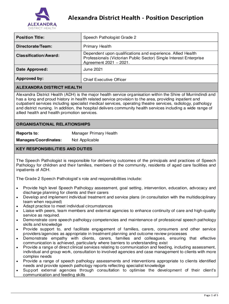 Alexandra District Health Position Description Position Title:Speech Pathologist Grade 2Directorate/Team:Primary Health Dependent upon qualifications and experience. Allied Health Professionals (Victorian