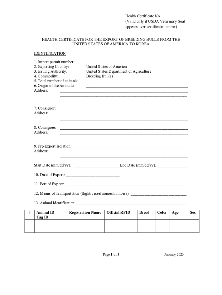 Get the free Health Certificate for Export of Breeding Bulls