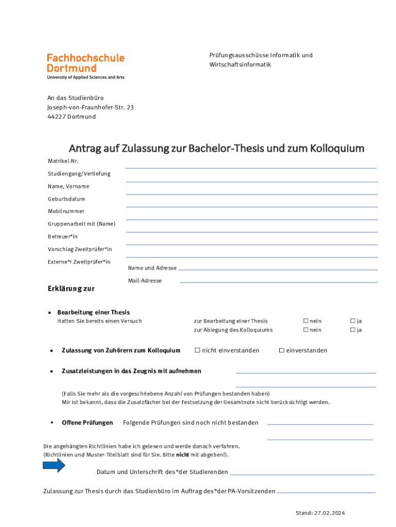 Prfungsausschsse Informatik und WirtschaftsinformatikAn das Studienbro JosephvonFraunhoferStr. 23 44227 DortmundAntrag auf Zulassung zur BachelorThesis und zum Kolloquium MatrikelNr. Studiengang/Vertiefung