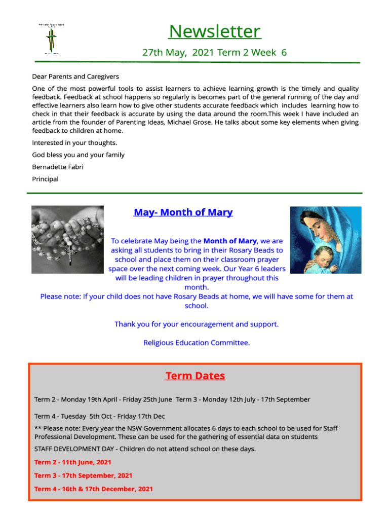 This newsletter addresses various school activities and initiatives at St Patrick\'s Primary School, including the importance of feedback for learning, upcoming term dates, religious events, athletic carnivals, attendance policies, and community contributions. It emphasizes parental involvement and includes notices regarding uniform changes, sacramental preparations, and school wellbeing services.
