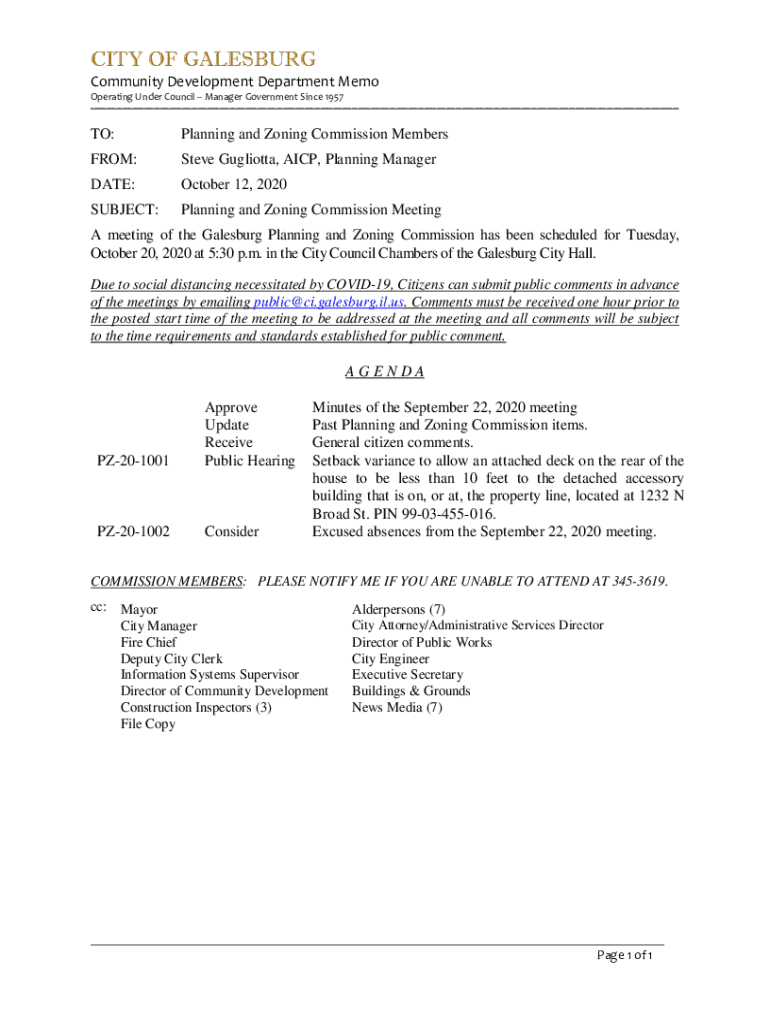 This memo outlines the agenda and details regarding the Planning and Zoning Commission meeting scheduled for October 20, 2020, in Galesburg, including a variance application, public comment procedures due to COVID-19, and updates from previous meetings.