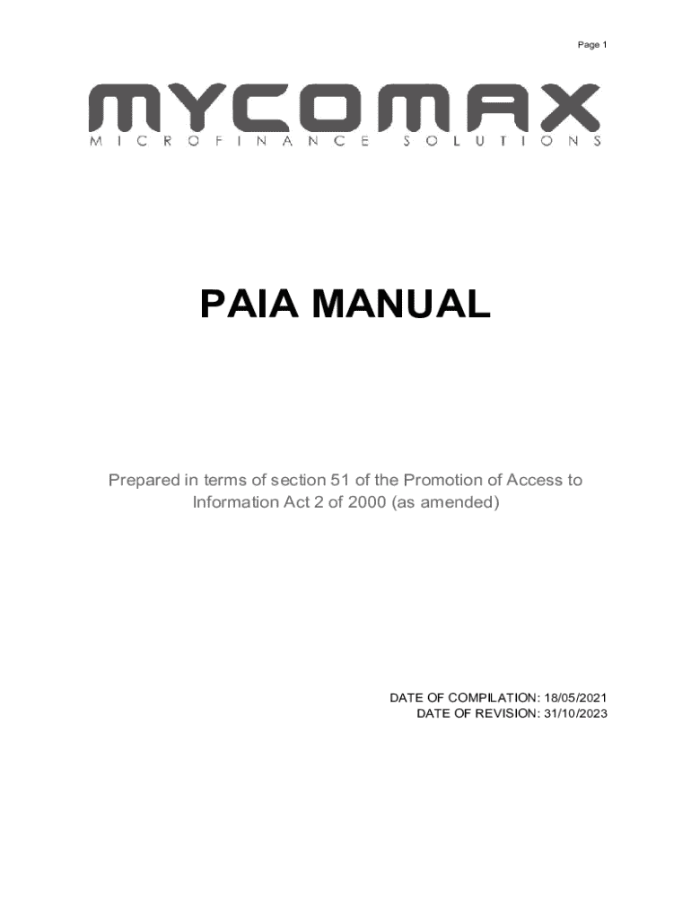 This PAIA Manual outlines the procedures and contact details necessary for accessing information held by Mycomax MicroFinance Solutions (Pty) Ltd, as per the provisions of the Promotion of Access to Information Act, No. 2 of 2000. It explains the purpose of the manual, the categories of records available, and processes for requesting access to information.