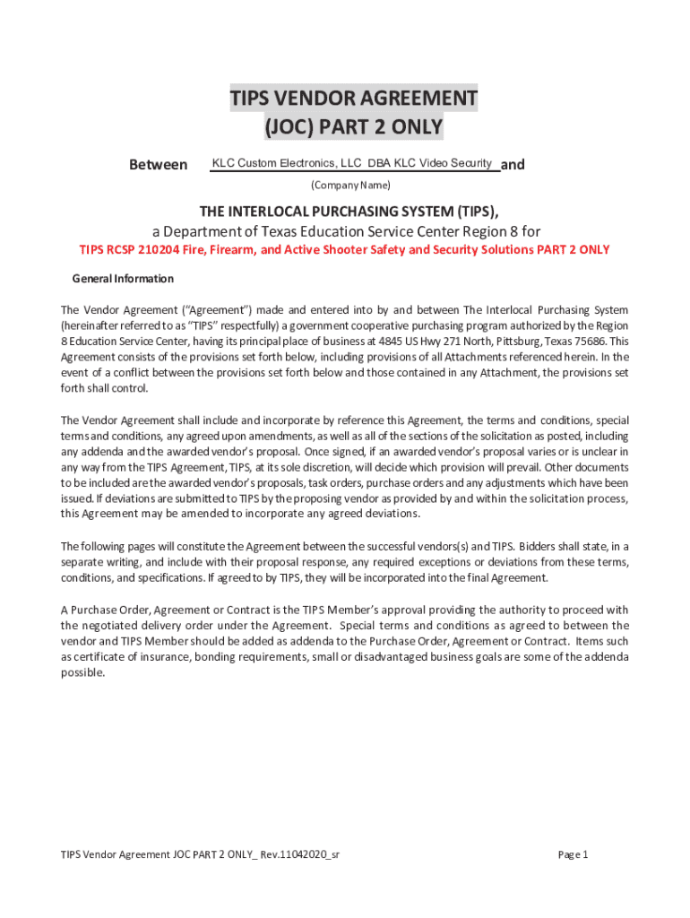 TIPS VENDOR AGREEMENT (JOC) PART 2 ONLY BetweenKLC Custom Electronics, LLC DBA KLC Video Securityand(Company Name)THE INTERLOCAL PURCHASING SYSTEM (TIPS), a Department of Texas Education Service Center