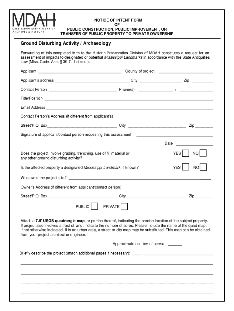 NOTICE OF INTENT FORM OF PUBLIC CONSTRUCTION, PUBLIC IMPROVEMENT, OR TRANSFER OF PUBLIC PROPERTY TO PRIVATE OWNERSHIPGround Disturbing Activity / Archaeology Forwarding of this completed form to the