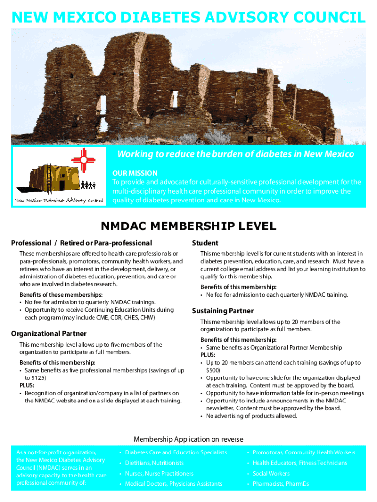 The New Mexico Diabetes Advisory Council (NMDAC) aims to reduce the burden of diabetes in New Mexico by providing advocacy and professional development for health care professionals. This document outlines the membership levels, benefits, and the application process for individuals and organizations interested in diabetes education, prevention, and care.
