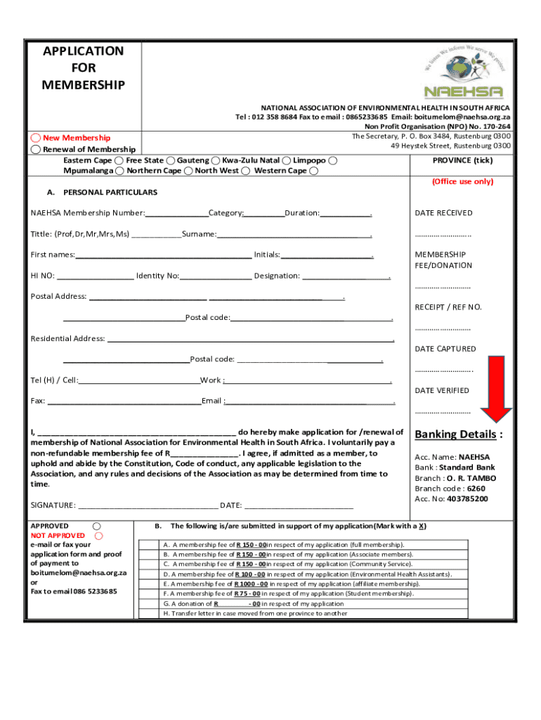 APPLICATION FOR MEMBERSHIP NATIONAL ASSOCIATION OF ENVIRONMENTAL HEALTH IN SOUTH AFRICA Tel : 012 358 8684 Fax to email : 0865233685 Email: boitumelom@naehsa.org.za Non Profit Organisation (NPO) No.