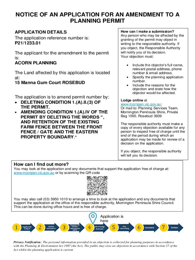 This document serves as a notice for an application to amend Planning Permit P21/1233 concerning the development at 15 Manna Gum Court, Rosebud. The application seeks to amend specific permit conditions related to fencing that are in conflict with a restrictive covenant.