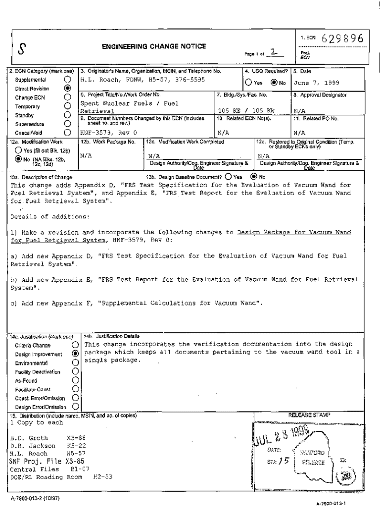 S429896......................................ENGINEERING CHANGE NOTICEFToj.Pago 1 Of3. Originatofs Name, Organization, MSIN, and Telephone No.!. ECN Categoly (mark one) Supplemental0Direct Revision@Change