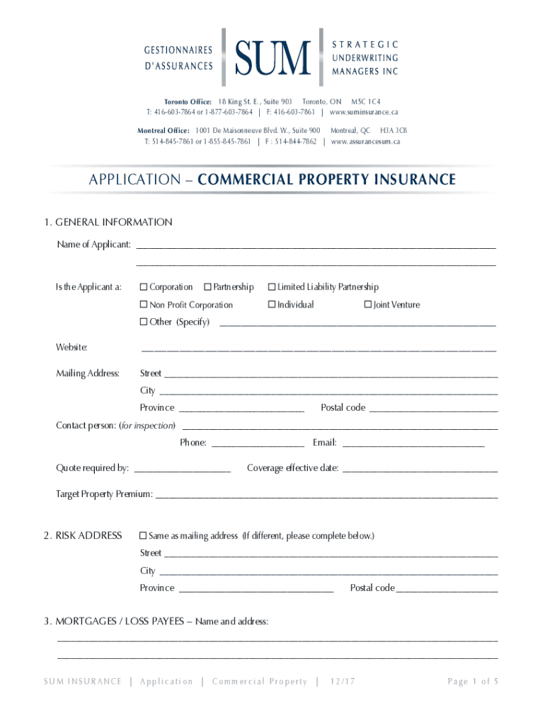 This document is a comprehensive application form for commercial property insurance, detailing necessary information about the applicant, property specifics, occupancy details, construction characteristics, coverage requirements, previous insurance records, and claims history. It serves as a foundation for assessing risk and issuing insurance policies.