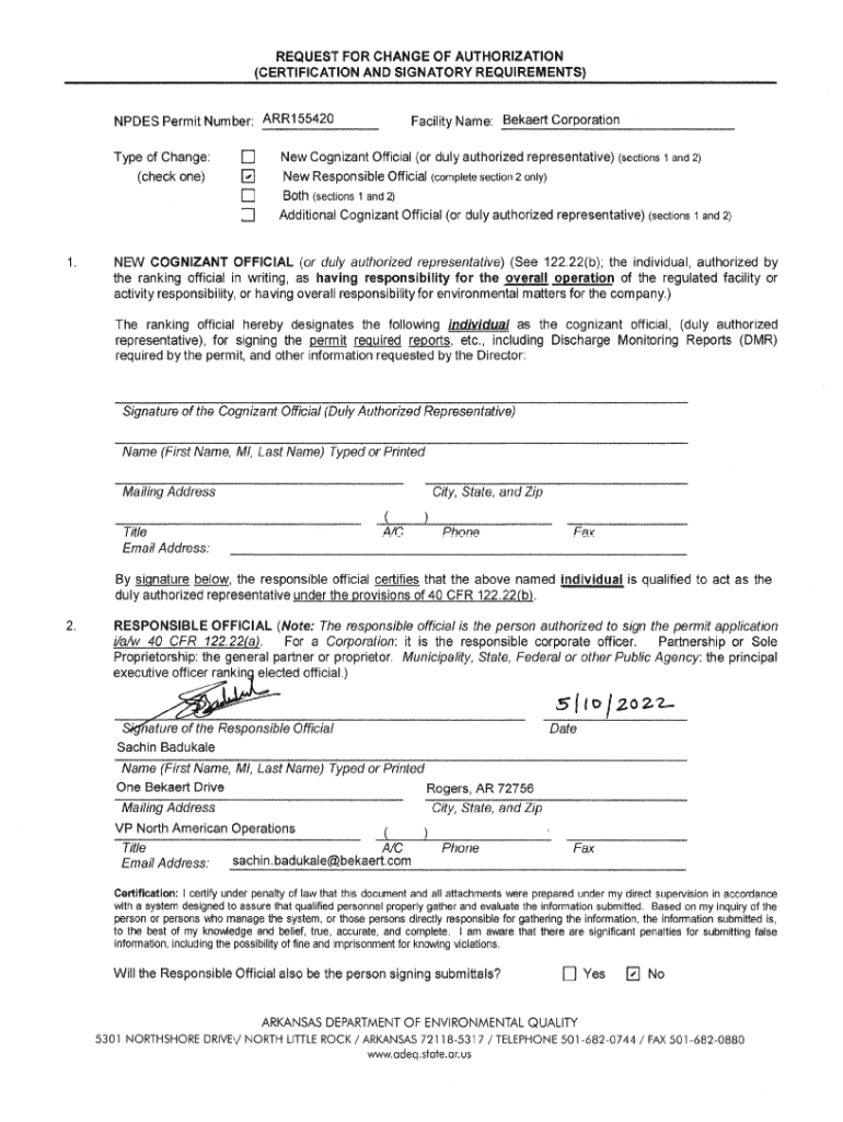 This document serves as a formal request for a change of authorization related to the NPDES Permit Number ARRI 55420 for Bekaert Corporation. It includes details regarding the responsible official and cognizant official for environmental matters at the facility, certification statements, and contact information.