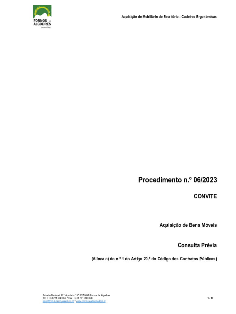 Aquisio de Mobilirio de Escritrio Cadeiras ErgonmicasProcedimento n. 06/2023 CONVITEAquisio de Bens MveisConsulta Prvia (Alnea c) do n. 1 do Artigo 20. do Cdigo dos Contratos Pblicos)Estrada Nacional