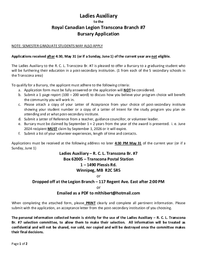This document details the application process for a bursary offered by the Ladies Auxiliary to the Royal Canadian Legion Transcona Branch #7. It outlines eligibility criteria, application requirements, and submission guidelines for graduating students pursuing post-secondary education.