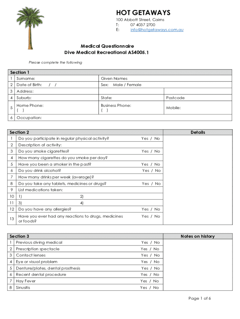HOT GETAWAYS 100 Abbott Street, Cairns T: 07 4037 2700 E: info@hotgetaways.com.auMedical Questionnaire Dive Medical Recreational AS4005.1 Please complete the followingSection 1 1Surname:Given Names2Date
