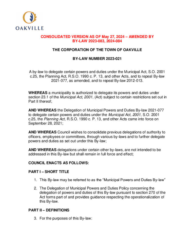 This by-law serves to delegate certain powers and duties under the Municipal Act, Planning Act, and other relevant Acts, consolidating previous delegations and repealing former by-laws. It outlines the roles and responsibilities of municipal officers, including the Chief Administrative Officer, as well as specific delegated authorities for various functions within the Corporation of the Town of Oakville.