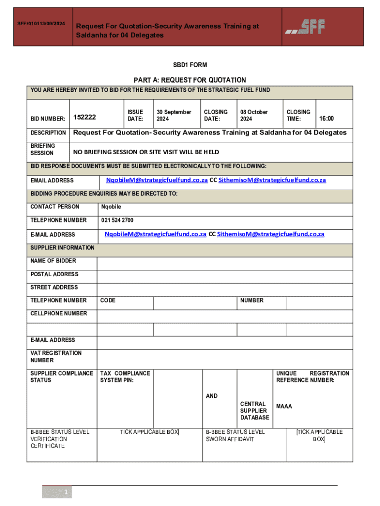 This document is a Request for Quotation (RFQ) issued by the Strategic Fuel Fund for security awareness training to be conducted at Saldanha for four delegates. It outlines the bidding process, eligibility requirements, submission guidelines, evaluation criteria, and necessary documentation for bidders.