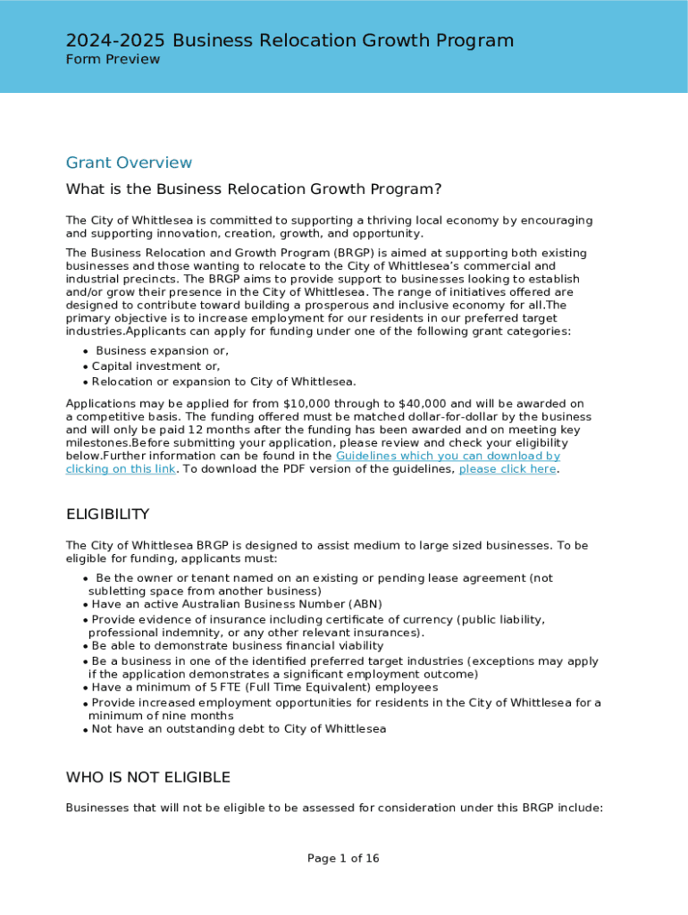 20242025 Business Relocation Growth Program Form PreviewGrant Overview What is the Business Relocation Growth Program? The City of Whittlesea is committed to supporting a thriving local economy by