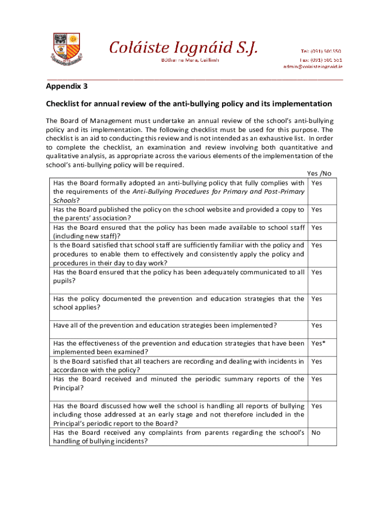 This document serves as a checklist for the annual review of the school\'s anti-bullying policy and its implementation. It outlines the necessary steps and considerations for the Board of Management to ensure compliance, effective communication, and evaluation of strategies related to bullying prevention within the school.