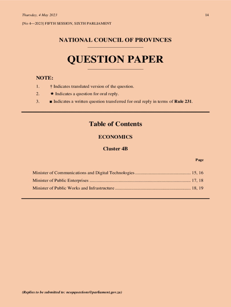 Thursday, 4 May 202314[No 42023] FIFTH SESSION, SIXTH PARLIAMENTNATIONAL COUNCIL OF PROVINCES ___QUESTION PAPER ___NOTE: 1. Indicates translated version of the question.2. Indicates a question for