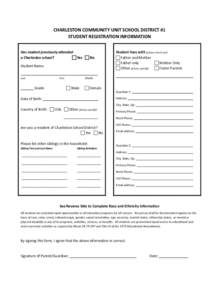 This document serves as a checklist for enrolling new students in the Charleston Community Unit School District. It provides detailed requirements for registration, including necessary documents, guardian information, residency proof, and additional forms related to health records and acceptable use policies. The checklist must be completed by school secretaries to ensure all enrollment criteria are met.