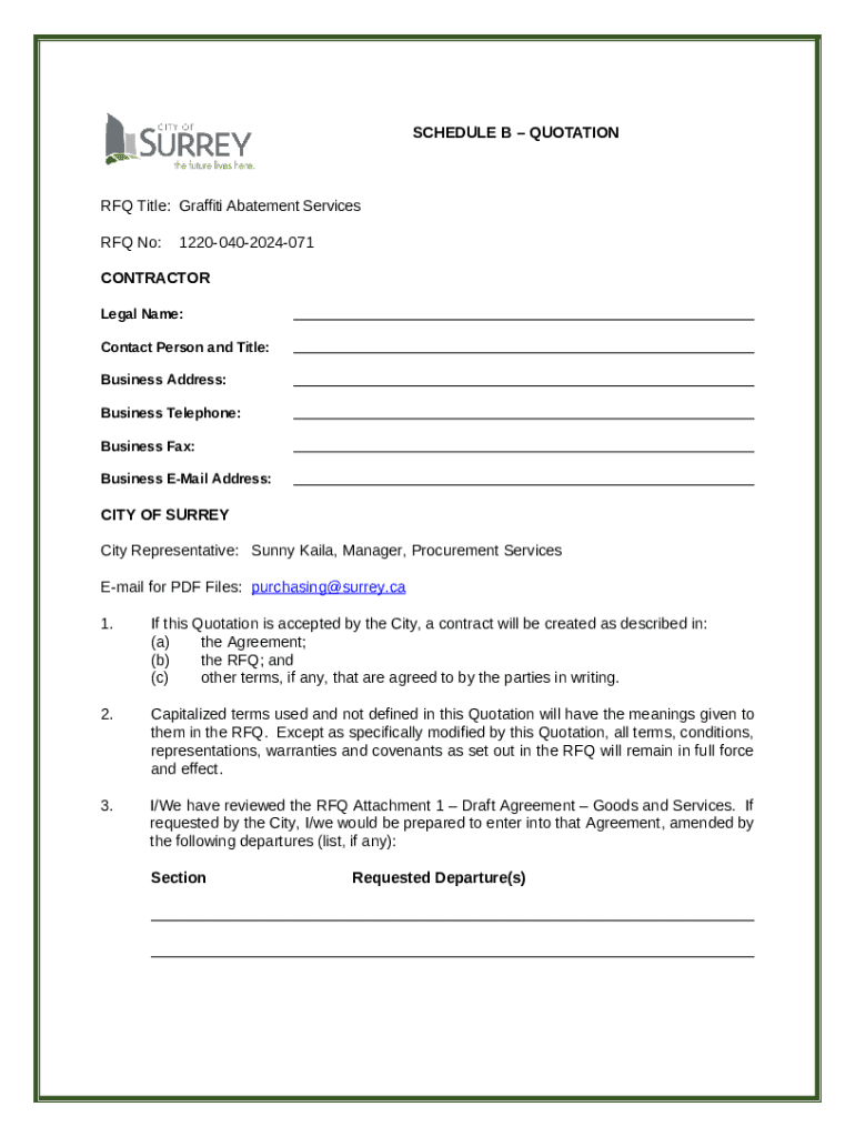 The RFQ Title:Graffiti Abatement Services is a Word document needed to be submitted to the required address in order to provide certain info. It needs to be filled-out and signed, which is possible in hard copy, or by using a particular solution such as PDFfiller. This tool allows to complete any PDF or Word document directly from your browser (no software requred), customize it depending on your needs and put a legally-binding e-signature. Once after completion, you can easily send the RFQ Title:Graffiti Abatement Services to the relevant individual, or multiple ones via email or fax. The blank is printable as well due to PDFfiller feature and options proposed for printing out adjustment. In both digital and in hard copy, your form will have a neat and professional look. Also you can save it as the template for further use, without creating a new document over and over. All you need to do is to edit the ready sample.