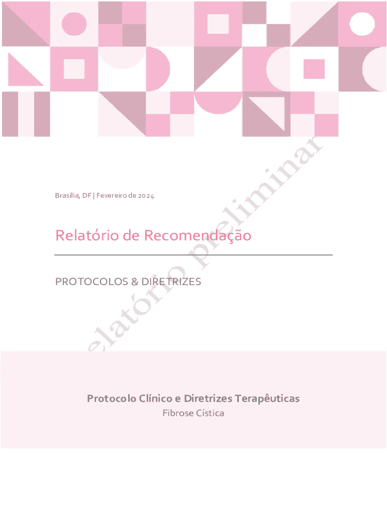 Braslia, DF | Fevereiro de 2024Relatrio de Recomendao PROTOCOLOS & DIRETRIZESProtocolo Clnico e Diretrizes Teraputicas Fibrose Cstica2024 Ministrio da Sade. permitida a reproduo parcial ou total desta