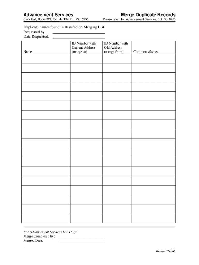 Advancement Services Clark Hall, Room 329; Ext.: 41134; Ext. Zip: 0256Merge Duplicate Records Please return to: Advancement Services, Ext. Zip: 0256Duplicate names found in Benefactor, Merging List